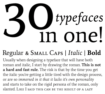 Median is a kind of typography which originated in a large process of research and selection of text families of classical, revival and modern types taking into consideration, in addition, various different historical periods. The idea to generate this average font for use in text led me to a lengthy process of data gathering in worksheets, which offered as a result a series of parameters which determined which were the proportions, color, spacing , and so on and so forth .Once the averaging stage was over, the signs for the Regular version were drawn in order to then get into the variances of italics and bold.